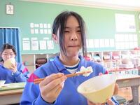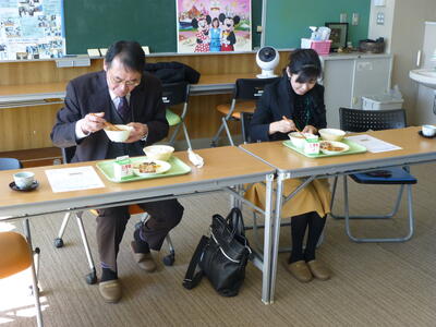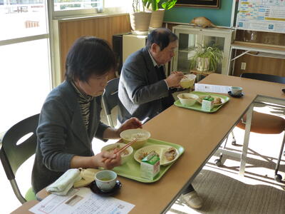 会議後には給食試食会を実施しました。栄養技師が献立について説明を行い、実際に試食していただきました。校長からは食品検査についての説明、評議員の方々からはアレルギーへの対応などについての質問が出されるなど、学校給食について知っていただく貴重な機会となりました。