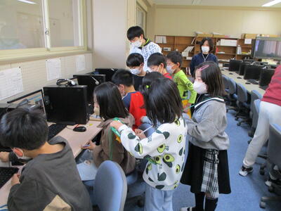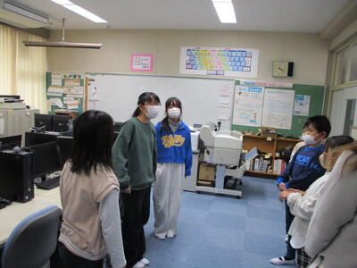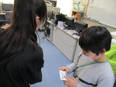 パソコンクラブでは、ロボット操作のプログラミングを間近で見たり、パソコンで作った名刺をもらったりしました。
