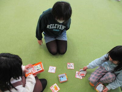 ゲーム・イラストクラブでは、福笑い、竹とんぼ、だるま落とし、けん玉、カルタなどの昔遊びを体験しました。