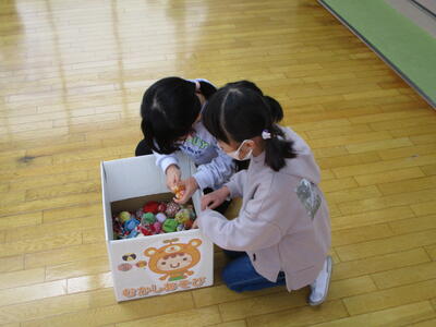 鬼の顔を貼った段ボール箱にボールを当て、たくさん倒した方が勝ちという豆まき対決ゲームをしました。