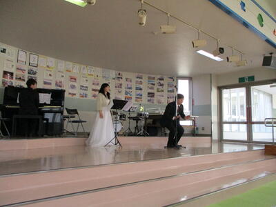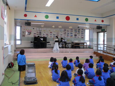 2月9日(木)日本音楽家ユニオン スマイルプロジェクトの方に来ていただき、1・2・3年生向けにスマイルコンサートを開催しました。曲目は、情熱大陸、バッハの平均律、スーパーカリフラジリスティックエクスピアリドーシャス(メリーポピンズの劇中歌、ディズニーランドでも使用されている)、カントリーロードなどです。子どもたちは、目の前で奏でられるピアノ、フルート、打楽器の音色に聴き入ったり、またボディパーカッションで演奏に参加したりして、とてもすばらしい時間を過ごすことができました。スマイルプロジェクトの皆さま、本当にあがとうございました。