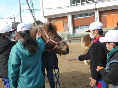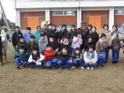 南相馬市経済部観光交流課の事業として実施された「馬とのふれあい学習」に本校の4年生から6年生の児童27名が参加しました。この事業は、市の将来を担う子どもたちに、本市の特徴である馬事文化に触れてもらい、興味・関心を醸成することを目的に企画されたもので、公益財団法人ハーモニィーセンターが運営する茨城県取手市の小貝川ポニー牧場から4頭のポニーがやってきました。
