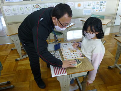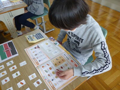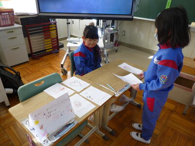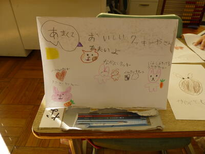 今日の1年生の国語は、「ものの 名前」の単元の最後の学習として、おみせやさんごっこを行いました。前の時間までに子どもたちそれぞれが絵と言葉で一つ一つ売る物を作り準備してきました。今日は、子どもたちがお店の人とお客さんに別れてごっこ遊びを楽しみました。
