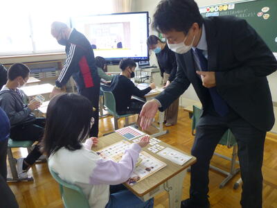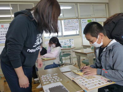 5年生の外国語の授業は、「ふるさとメニューを注文しよう」のテーマで、子どもたちがレストランの店員になり、お客さん役の先生と会話する学習に取り組みました。