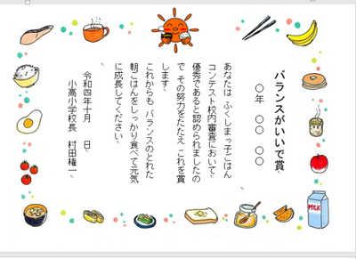 夏休みに、ご家庭で取り組んでいただいたごはんコンテストの作品について校内で表彰を行いました。