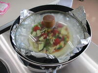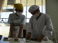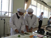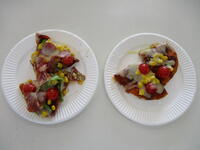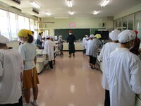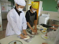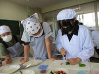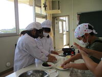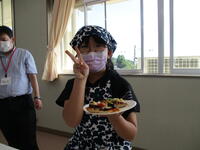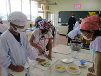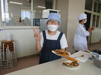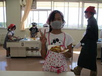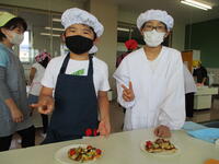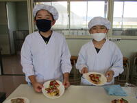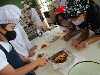 9月26日(月)JAさんに来ていただき、4・5・6年生が米粉ピザ作りをしました。米粉に強力粉、砂糖、塩、水などを入れてよくこね、手にオリーブオイルをつけて平たく伸ばしました。手にオリーブオイルをぬるのにおっかなびっくりの子どもたちもいましたが、グループで協力して、無事ツヤツヤの平たいまるに成形することができました。トッピングはトマト、ナス、ピーマンなどの夏野菜と、缶詰のコーン、チーズです。自分たちで薄く、小さく切った野菜やチーズをきれいに並べ、フライパンにピザをセットしました。焦げないようにしっかり見ながら、使った用具を手際よく片付けていくところはさすが上学年です。焼きあがってフライパンのふたをとると、粉が焼けた香ばしい香りと、野菜の甘い香りが広がりました。歓声をあげたいところですが、はやる気持ちをおさえつつ、ピザを切り分けました。感染対策に気を付けて調理し、それぞれの教室に持ち帰って、給食時と同様黙食でおいしくいただきました。自分で手作りしたピザは、格別のおいしさだったと思います。これからも食べ物や料理に興味を持ちつづけ、豊かな食生活を送ってほしいと思います。大切なことに気づかせてくださったJAさん、本当にありがとうございました。