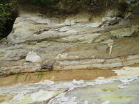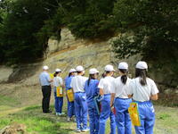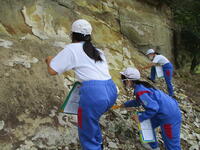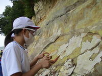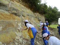 学校からわずか約1km離れたところで,地層が見られることに子どもたちもびっくり。簡単にはがれる地層に,また,びっくり。