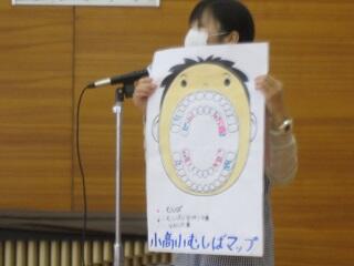 また、小高小むし歯マップ(全校生の歯科検診の結果で、むし歯・むし歯になりそうな歯を歯別に示したもの。)の紹介もありました。治療が済んだ歯は白くなっていきます。全校生で、歯もむし歯マップも白くしていきたいですね。