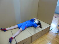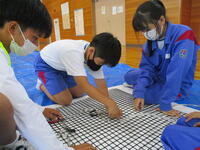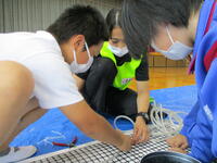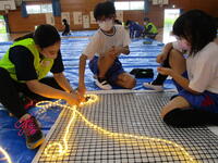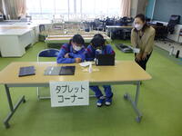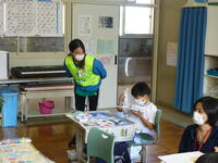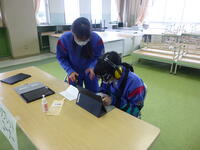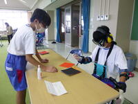 児童たちは、ゴーグルや手袋、おもりの入った装具をつけることによって、高齢者の目の見え方や手足の動き方を疑似体験しました。その状態で実際に歩いたり、タブレットを操作したり、はさみで紙を切ったりすることに挑戦しましたが、どの児童も悪戦苦闘していました。いつも当たり前にできていることが高齢者になると難しくなることに気がつきました。