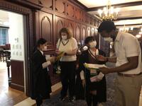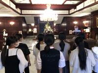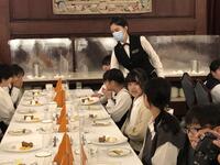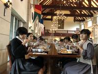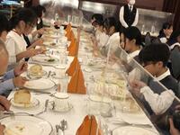 いよいよ夕食です。みんなドレスコートに合った服装で、Course dinnerです。夕食の前には、テーブルマナーについて学習しました。