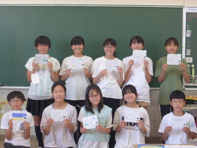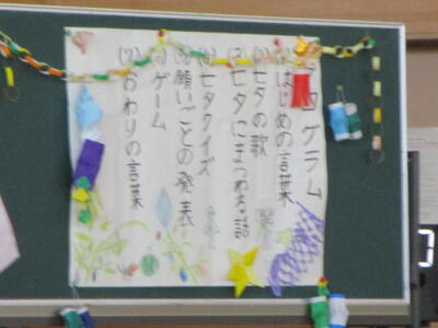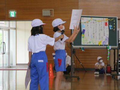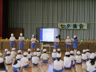 7月6日(水)体育館で七夕集会を行いました。4、5、6年生が児童会委員会ごとに担当を決めて、司会進行、七夕の歌、七夕にまつわる話、七夕クイズを行いました。願いごとの発表では、「将来アイドルになれますように」「休まないで元気に学校に来れますように」「ビート板なしで泳げますように」「足がもっと速くなりますように」「家族やいとこと旅行に行けますように」「家族みんなが元気で過ごせますように」と、将来の夢や、自分の目標、家族の健康を願うものがありました。最後に、体育委員会の発案でけいどろをして楽しく遊びました。七夕なので、追いかける人は織姫と彦星、逃げる人は星になりました。みんなの願いがかなうといいですね。