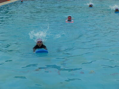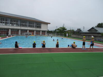 種目は、1・2年生が宝さがし競争、水中かけっこ、ビート版バタ足、3・4年生がけのび、ふし浮き、バタ足、25mです。今までの練習の成果を生かし、少しでも長く泳げるようにがんばりました。 練習ではビート版を使っていても、本番ではビート版なしで泳げた子もいました。記録会が終わった後、「宝さがしで7こ拾えたよ!」「練習より記録のびたよ!」「水中かけっこ1位だったよ!」とうれしそうに話す姿も見られました。