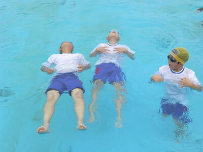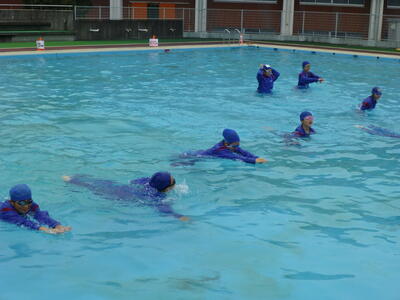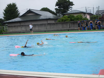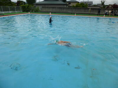 後半の着衣水泳では、着ている服が水を含んで思ったように動けないこと、ペットボトルが1本でもあれば浮力を得ることができることを身をもって体験できました。あおむけに浮くときは、首を後ろに反らし、鼻と口が水にしずまないようにしました。水の事故はあってはならないことですが、万が一まきこまれてしまったら、しっかり自分の身を守ってほしいと思います。