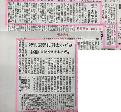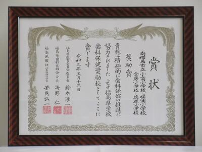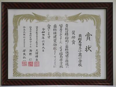 新聞報道等でご存知の方もいらっしゃると思いますが、このたび福島県学校歯科保健優良校表彰(よい歯の学校表彰)で「奨励賞」をいただきました。先日の全校集会で子ども達にもお披露目しました。これは、子ども達のむし歯予防や歯科治療のがんばりの成果とご家庭の協力、今村歯科・矯正歯科医院をはじめとした関係機関の皆様のご協力の賜です。これからも、歯と口の健康の保持増進をすすめていきたいと思います。