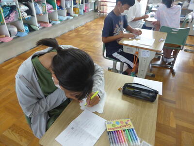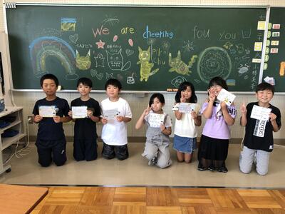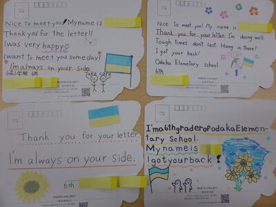 6月30日に小高区の双葉屋旅館の小林友子様とスタジオ・サードアイのすぎた和人様にお越しいただき、5・6年生の児童がウクライナの現状ついて講話をいただきました。毎年クリスマスカードを送ってくれていたジトミール第25番学校が爆撃を受け瓦礫となってしまったことを知り、子どもたちは自分たちに何かできることはないか考えました。その後、子どもたちは励ましのメッセージを送ることを決め、ポストカードを作成しました。