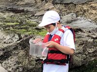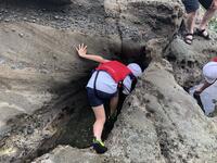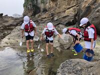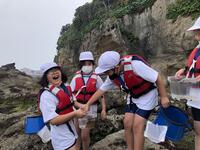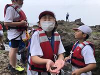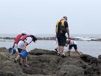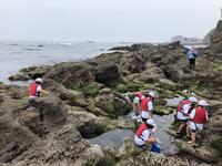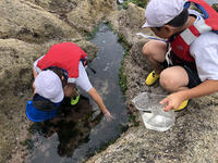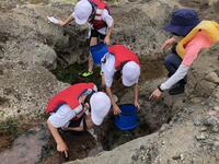 磯遊びの様子です。自然の家の方のお話を聞いて、少しずつ岩場の生き物を探します。