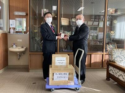 1月17日(月)に日本赤十字社福島県支部を通じて,鹿児島県出水市の小中学校から支援品が届きました。震災後から『出水の学校まごころ便「ツルの里からのお年玉」』として毎年支援品を送っていただいています。今回は,切通(きずし)小学校からもち米を,米ノ津東(こめのつひがし)小学校からサツマイモを,野田(のだ)中学校から図書カードをいただきました。出水市の小中学校の温かいご支援に心より感謝いたします。本当にありがとうございました。