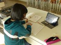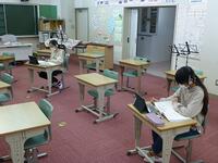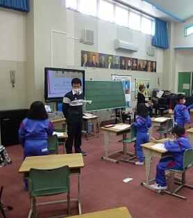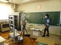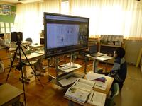 6年生担任が教室に据え付けたカメラの前で,デジタル教科書や学習支援アプリ(ロイロノート)を使用しながら授業を行い,校舎内の複数の教室に分かれた児童にビデオ会議アプリ(Google Meet)を用いて配信しました。子どもたちはいつもと違う環境の中でも,全員が真剣な表情で授業に取り組み,活発に発言をしていました。