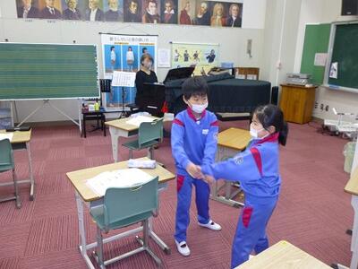 本日の2年生の音楽の授業は小高中学校の音楽の先生をお招きして,『日本の歌でつながろう』の単元の中の「なべなべそこぬけ」を学習しました。子どもたちは,中学校の音楽の先生の伴奏に合わせて,二人一組になって遊びながら楽しそうに歌っていました。