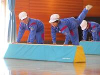 側方倒立回転に挑戦!基礎練習からしっかり行っていました。タブレットで撮影して、動きを確認しています。友達同士でアドバイスし合いながら、練習していたのが印象的です。