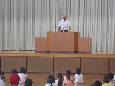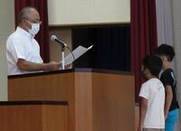 始めに、校長先生からお話をいただきました。とても大事なことは3つ、「命を大切にすること」「怪我をしないこと」「周りの人に迷惑をかけないこと」です。以上の3つを守って、8月23日の2学期始業式に会う約束をしました。