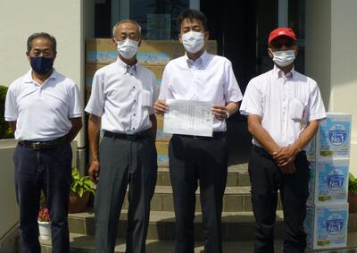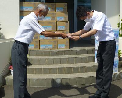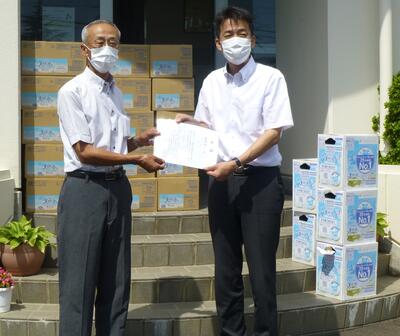 本日26日(木)に、南相馬市議会議員の渡部寛一様と、小高ボランティアセンターの方2名が小高小学校に来られ、「熱中症防止等のために」と、飲料水用ペットボトル30ケースを寄贈していただきました。