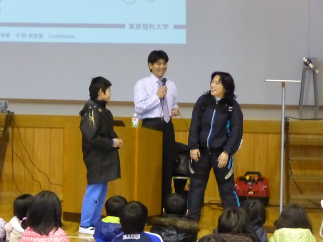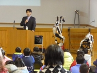 27日(火)に、東京理科大学小林宏先生をお招きし、特別授業を行いました。小林先生は、ロボットの研究者で、小学校4年生の国語の教科書に「『ゆめのロボット』を作る」という文章を載せている方です。どんなロボットか?小林先生が研究しているのは、鉄腕アトムのような人型ロボットや工場の組み立てロボットではなく、人が体につけて動きを助けてくれる「マ