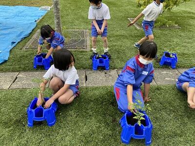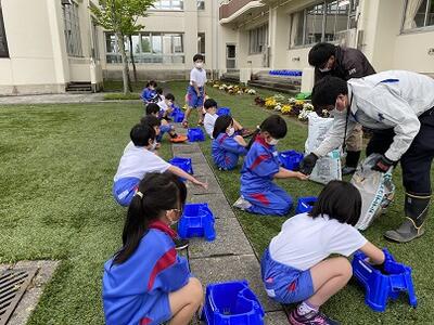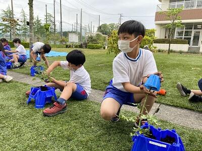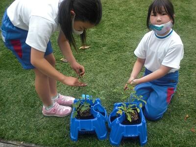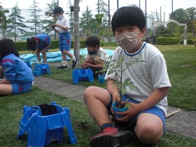 2022年5月17日 14時05分今日は、2年生がJAさんのご協力のもと、ミニトマトの苗を植えました。ミニトマトの苗を観察して、「まだ実がなってないのに、トマトのにおいがする!」「くきにひげがはえてる!!」などいろいろな発見があったようで、「どうして肥料が必要なんですか?」「いつ、どのくらい、水をあげるといいんですか?」など積極的にJAの方に質問をしている姿が印象的でした。これから2年生の子ども達は、ミニトマトの成長を観察するだけでなく、お世話もします。(ミニトマトが苦手という声もありましたが、自分で育てることで克服への近道になるかもしれません。この経験を通して、少しでも苦手意識が減ることを願っています。)