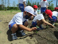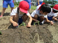 5月26日(木)JAさんにご協力いただき、1年生はサツマイモの苗を植えました。土に穴を掘って苗を植え、水をかけてあげると「イモからはなれたくなーい」と、大切そうに苗を見つめている姿も見られました。これからどんなふうに成長していくのか観察し、どんなお世話が必要なのかを体験しながら学んでいきます。食べ物を自分の手で育てるという意味でもとてもいい経験になります。秋になって収穫できる日が楽しみですね。