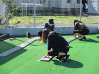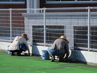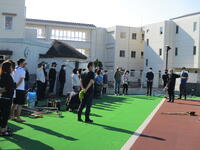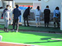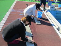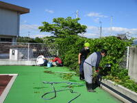 それぞれ担当に分かれて、排水溝にたまった泥や落ち葉を高圧洗浄機や水バケツで流したり、フタについた泥をたわしでていねいに落としたり、更衣室、シャワー室をデッキブラシでみがいたり、プールサイドの落ち葉やごみを取り除いたりしました。ごみも思ったより落ちていて、ごみ袋が満杯になりました。