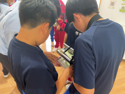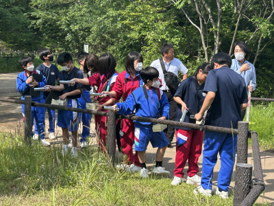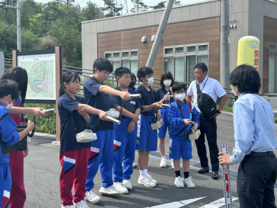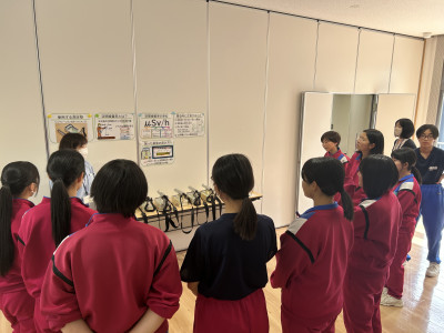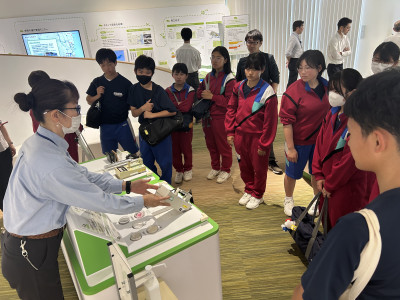 体験活動では、空間線量率測定器(シンチレーション式サーベイメータ)を用いて施設内外の放射線量測定を行いました。また、施設見学では、除染土壌や特定廃棄物などがどのように処理されているか担当の方より丁寧に説明をして頂きました。