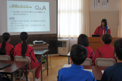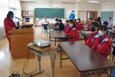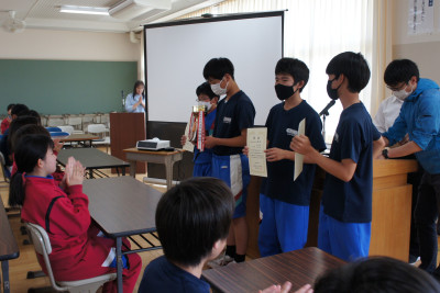 集会のメインは、春休みに市教育委員会主催で行われたシンガポール研修に参加した3年生の報告会でした。参加生徒は自ら研修課題を設定して、現地での見聞や研修を通して分かったことや感じたことを分かりやすく発表してくれました。聞いていた他生徒も新たな気づきや学びの多い、素晴らしい発表でした。