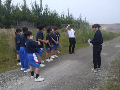 はじめに「万葉の里風力発電所」へ見学に行きました。暑い中での見学でしたが、担当者の方に20個以上の質問をする積極的な1年生の姿がみられました。