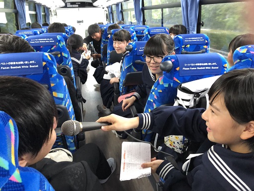 2018年4月25日 10時11分中郷SAを過ぎ、バスの中で実行委員が準備したレクで盛り上がっています!