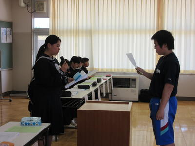 行いました。生徒会本部、図書委員会、放送委員会、保健委員会、給食委員会、美化委員会、それぞれの代表生徒から活動計画が述べられ、意見や質問が活発に行われました。