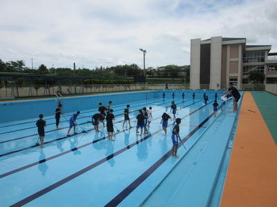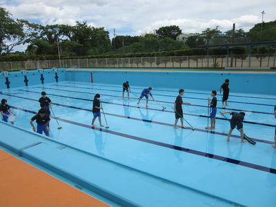 2019年6月17日 17時56分本日、東京電力ホールディングス株式会社の職員の方のご協力を得ながら全校生でプール清掃をしました。梅雨に入り天候が心配されましたが、全校生の日頃のおこないが良いためか好天の中で清掃を進めることができました。おかげで広い50mプールが今日一日できれいになりました。今後のプールの授業が楽しみですね。