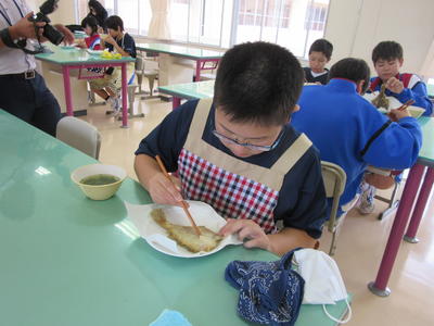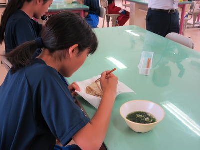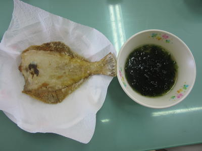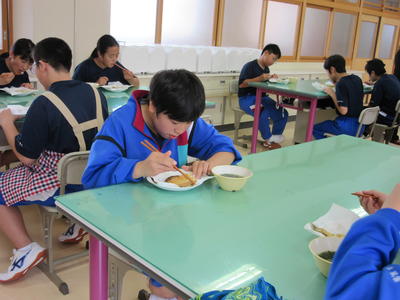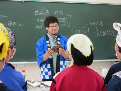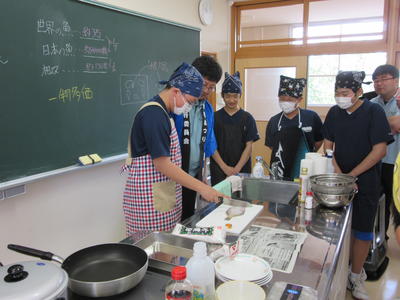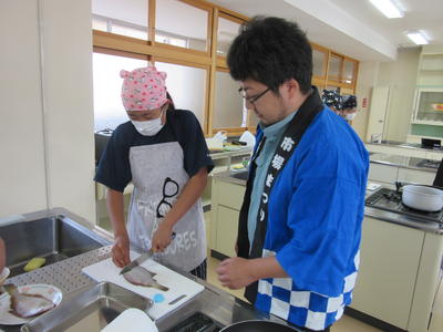 2019年6月19日 07時33分1学年家庭科の授業で相馬魚類株式会社からお魚マイスターの加藤さんと藤岡さんをお迎えして食育実践サポーターによる授業を行いました。今回の授業は地域の魚や漁業に関心を持ち、地域の食文化を理解して、地域の食材を生かした調理ができることを目的として進められました。導入部分では世界、日本、相双地区には何種類の魚がいるかなどのクイズをした後に、「コガレイのからあげ」、「シラウオとアオサのお吸い物」の調理実習に入りました。生徒は慣れないながらもお魚マイスターの説明を真剣な眼差しでよく聞きながら調理を進めていました。ぜひご家庭でも機会が有ったら今回の経験を生かしてお魚料理にチャレンジしてみてくださいね。