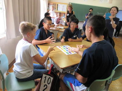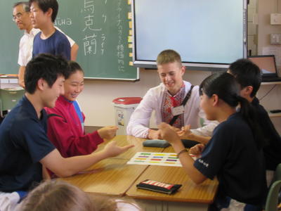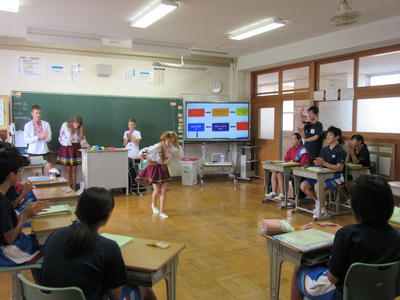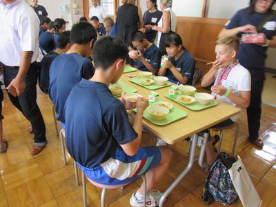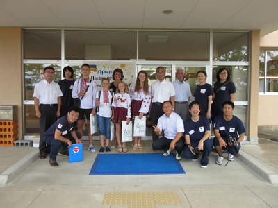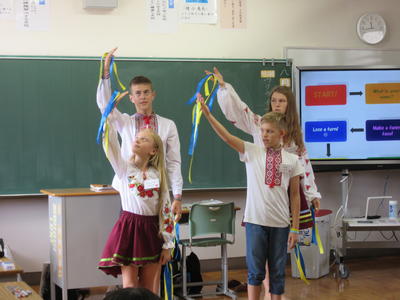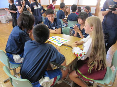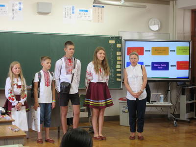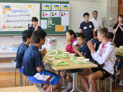 2019年8月26日 17時35分本日、一般社団法人「世界の子供たちのために」が企画する「ウクライナの子どもたちとの交流プログラム」の中でウクライナの中学生が4名来校しました。11時頃に到着し、4校時目2年生英語の授業に参加し交流を図りました。4名は自己紹介の後に練習してきた踊りを披露し、その後、グループに分かれて英語のすごろくを行い、本校生徒と一緒に活動を楽しみました。そして、最後に給食を一緒に食べてお別れしました。