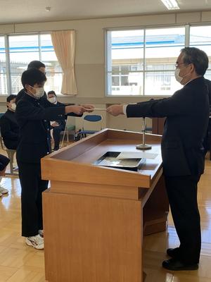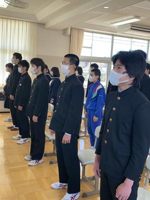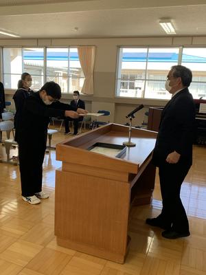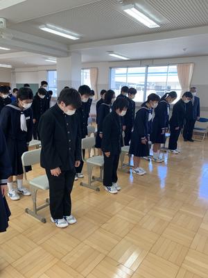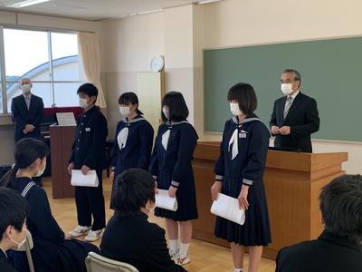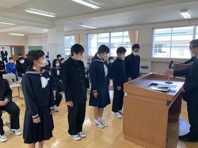 2020年3月23日 17時11分令和元年度の修了式を実施しました。3月4日以降休校となり、13日の卒業証書授与式以降も静かな校舎でしたが、本日は久しぶりに活気が戻った1日となりました。修了式では各学年の代表者が修了証書を授与した後に校長先生から式辞がありました。校歌の後には次年度の生徒会役員の任命式、英語検定の表彰などを行いました。美化作業を行い、10時半には下校となりましたが、有意義な時間を過ごすことができました。明日からは春休みとなりますが、これまで同様に1日1日を大切に過ごして4月6日の始業式の日に元気な姿を見せてくれることを願っています。