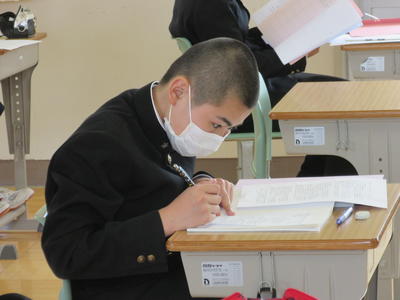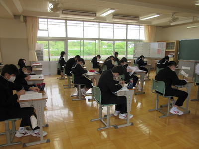 2020年5月12日 14時42分分散登校が始まり、今日は3年生21名全員が登校して元気な姿を見せてくれました。明日は2年生、明後日は1年生の登校日になります。週に1度の登校日ですが、少しずつでも学校の生活リズムに戻していければと考えています。授業は、午前中40分授業で5教科を行い、午後は30分授業で技能教科を行いました。教室はいつもの教室より広い多目的ホールを使用し机の間隔を1m以上空けて配置しました。今後も可能な限り3密にならない環境の下で授業を進められるように工夫していきたいと思います。