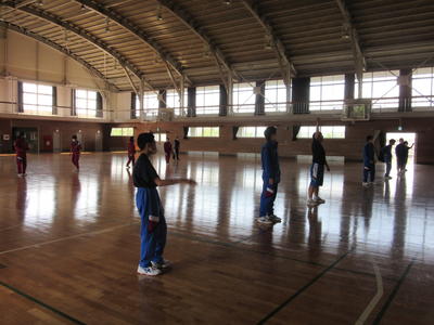 2020年5月13日 16時05分本日は2学年生徒が分散登校しました。昨日の3学年同様に午前中に5教科の授業を行い、午後は技能教科の授業を行いました。写真は保健体育の授業の様子です。体育館でお互いに間隔を広くあけて行いました。