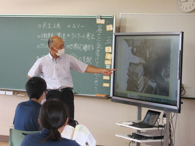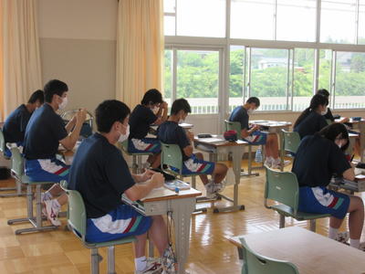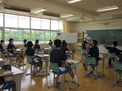 2020年8月5日 13時06分 1学期も残すところ今日を含めて3日となりました。長かった梅雨が明けて昨日、今日は真夏日でした。エアコンをフル稼働しつつ、窓を開けて換気をしながら授業を行っています。今日は、3年生社会の授業を参観しました。9問のQ&Aから始まり、日本国憲法について授業を進めていました。社会科教師から発問があると、正解、不正解を問わず、数多くの生徒から即座に回答があり、積極的かつ和やかな雰囲気で授業が進められていました。