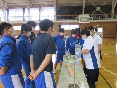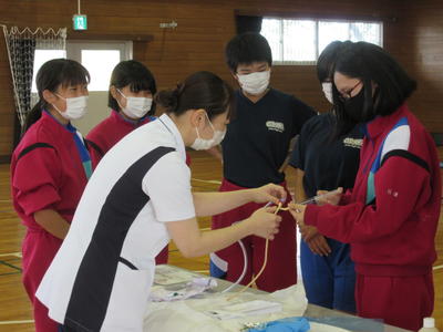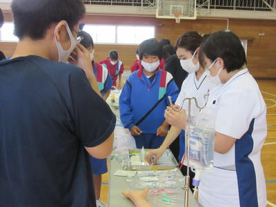 2020年10月15日 17時07分 2年生を対象に看護師の仕事を学ぶ学習会を行いました。小野田病院より3名の看護師が来校し、講話や看護師の仕事に必要な「7つ道具」の説明の後に実技体験をしました。生徒同士が互いに心音聴取をしたり、脈拍測定や点滴、尿道カテーテルの疑似体験を行ったりと普段の生活の中では決して行うことのできない貴重な体験ができました。今日の授業によって看護師の仕事の大変さや難しさ、大切さを学ぶことができました。