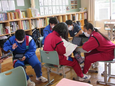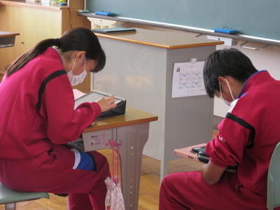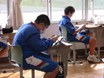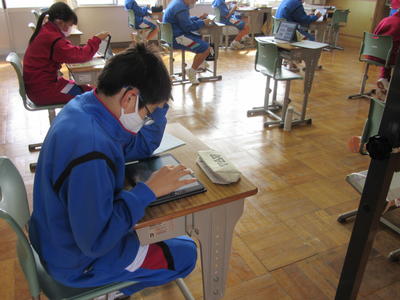 2020年10月16日 17時22分授業参観のために校舎を歩いていると、学級活動の時間に1,2年生がタブレット端末を活用しながら活動を進めていました。1年生は調べ学習で、2年生は文化祭の発表原稿作成をそれぞれタブレット端末を用いながら有効活用している姿が見られました。タブレット端末が生徒1人につき1台ずつ配備されてから様々な場面で活躍する機会が増えてきています。