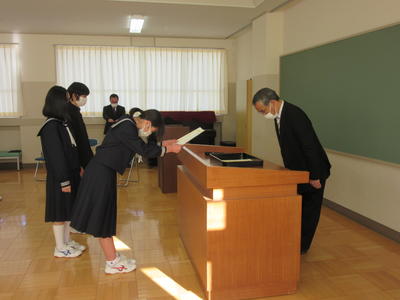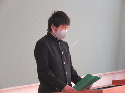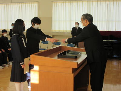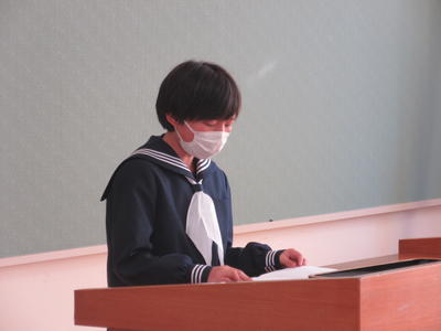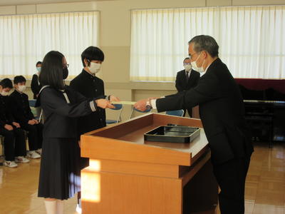 2020年12月23日 16時37分 今日で84日間の2学期が終了となりました。第2学期終業式を行った後に、各学年生徒代表から意見発表「2学期の反省と新年の抱負」がありました。どの代表生徒も2学期の反省点を明確にして、新たな目標立てをした立派な発表でした。その後、自主学習ノート優秀賞等の表彰がありました。