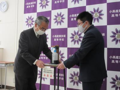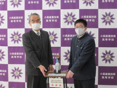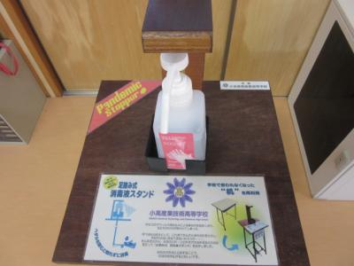 2021年1月20日 14時25分 本日、小高産業技術高等学校にて小高産業技術高等学校 機械科 課題研究班の代表生徒さんから同班製作の足踏み式消毒液スタンド「Pandemic Stopper」を寄贈いただきました。このスタンドは学校で使われなくなった机の再利用で作られたものであり、消毒液ボトルに合わせて高さが調節可能、ペダルを踏むと触れずに手指を消毒できる優れものです。今回、小高産業技術高等学校のご厚意により、今日まで製作したものの中で最後の1台にあたるものをいただくことができました。今後、必要とされる場所に設置して有効利用したいと思います。