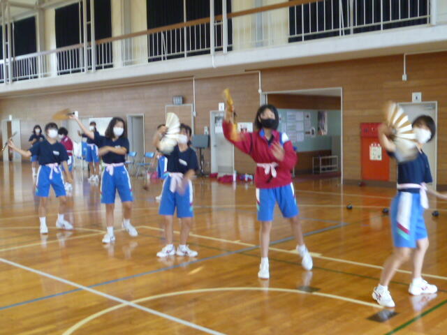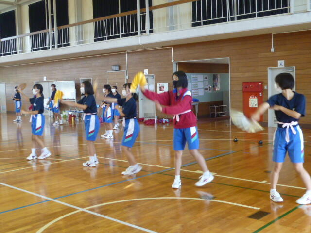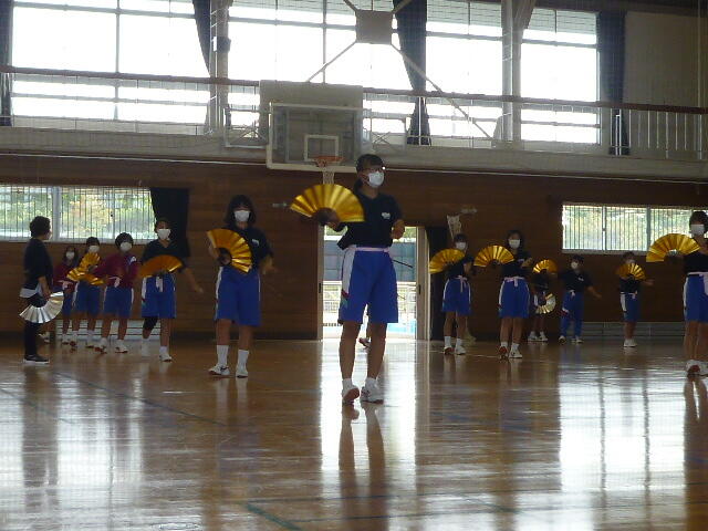 自主練に励む女子生徒です。5人でかけ声を合わせて練習しています。扇子の扱い方も上手になりましたね。