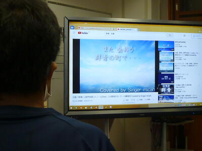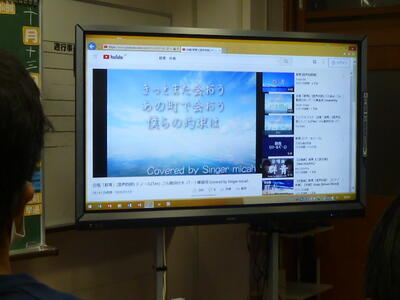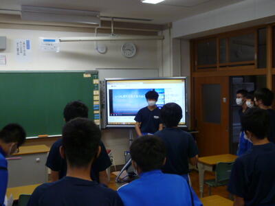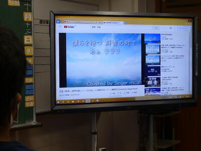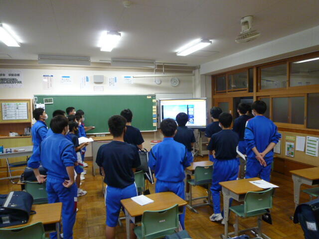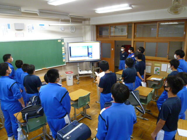 男子生徒は1年生の教室に集合です。デジタル黒板を見ながら練習をしています。