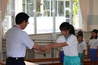 JRCの登録式が行われました。式では、登録証やワッペンの交付と共に、「考えるだけではなく、実行していくことが大切です」「世界的ではなくても身近なところからボランティアなどしてほしい」という話を校長先生やJRC担当の先生からいただきました。このJRCへの登録をきっかけに、あいさつ運動やゴミ拾いなど小さなことからコツコツと誰かのための活動を実践していって欲しいです。