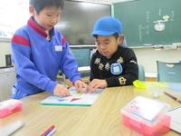 小高幼稚園の年長組の2名が、小学校の勉強の様子を見学に来ました。1年教室では、道徳の学習の様子を見せてから、学校生活について教えてあげました。運動会や学習発表会、給食や鉛筆の使い方などいろいろなことを伝えました。次に、色板を使って図形を作りました。幼稚園の子もとても上手にできていて1年生も感心していました。勉強の楽しさが少しだけでも伝わっていれば大成功です。その後、2年教室で読み聞かせも披露しました。入学式までもう少しです。学校って楽しいところだということを伝えられて大成功でした。